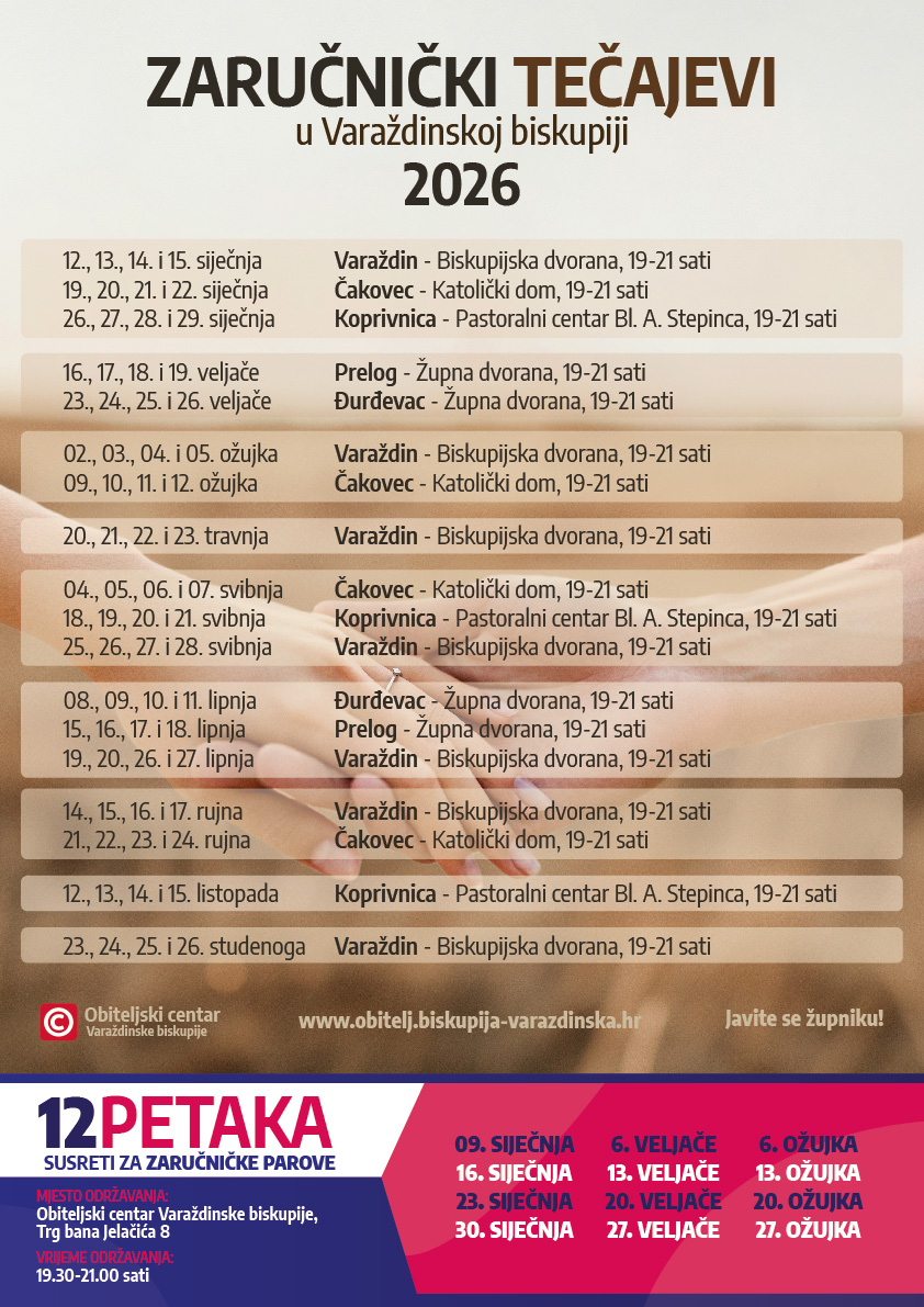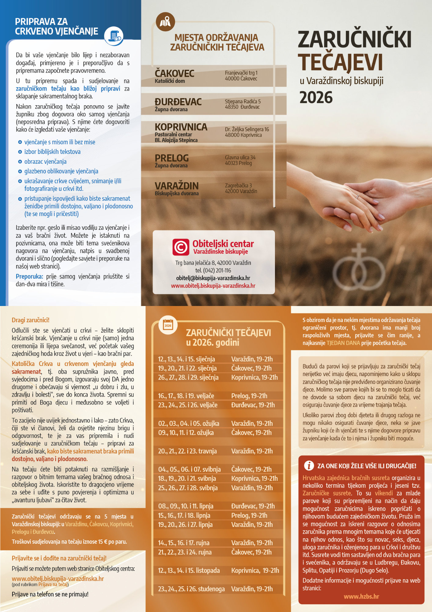 Objavljujemo raspored održavanja zaručničkih tečajeva u Varaždinskoj biskupiji u 2026. godini.