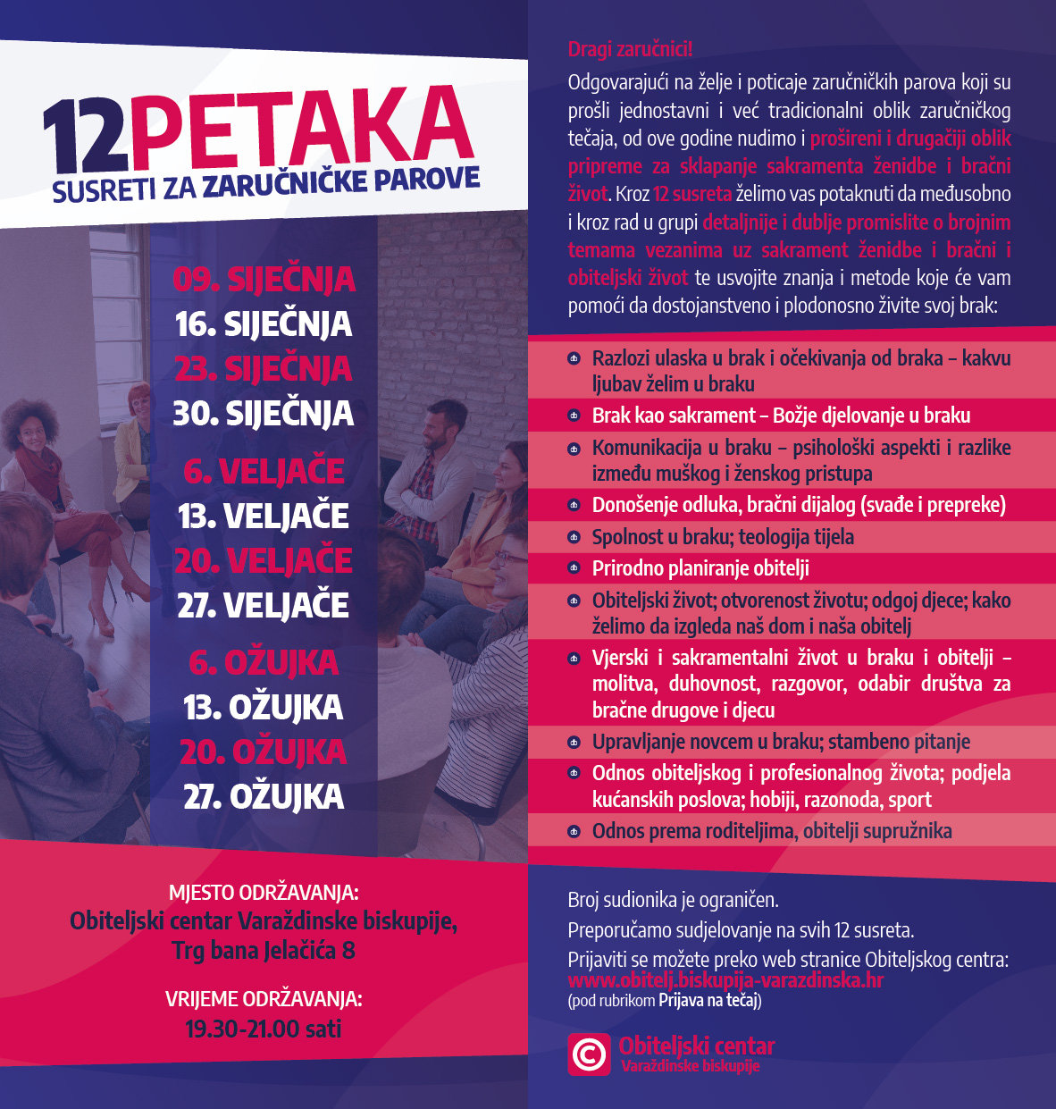 Uz mogućnost sudjelovanja na jednostavnom i već tradicionalnom obliku zaručničkog tečaja (više informacija u brošuri na poveznici), sljedeće godine zaručnički parovi mogu odabrati prošireni i drugačiji oblik bliže priprave za sklapanje sakramenta ženidbe. Više informacija možete pronaći u brošuri na poveznici: 12 petaka.